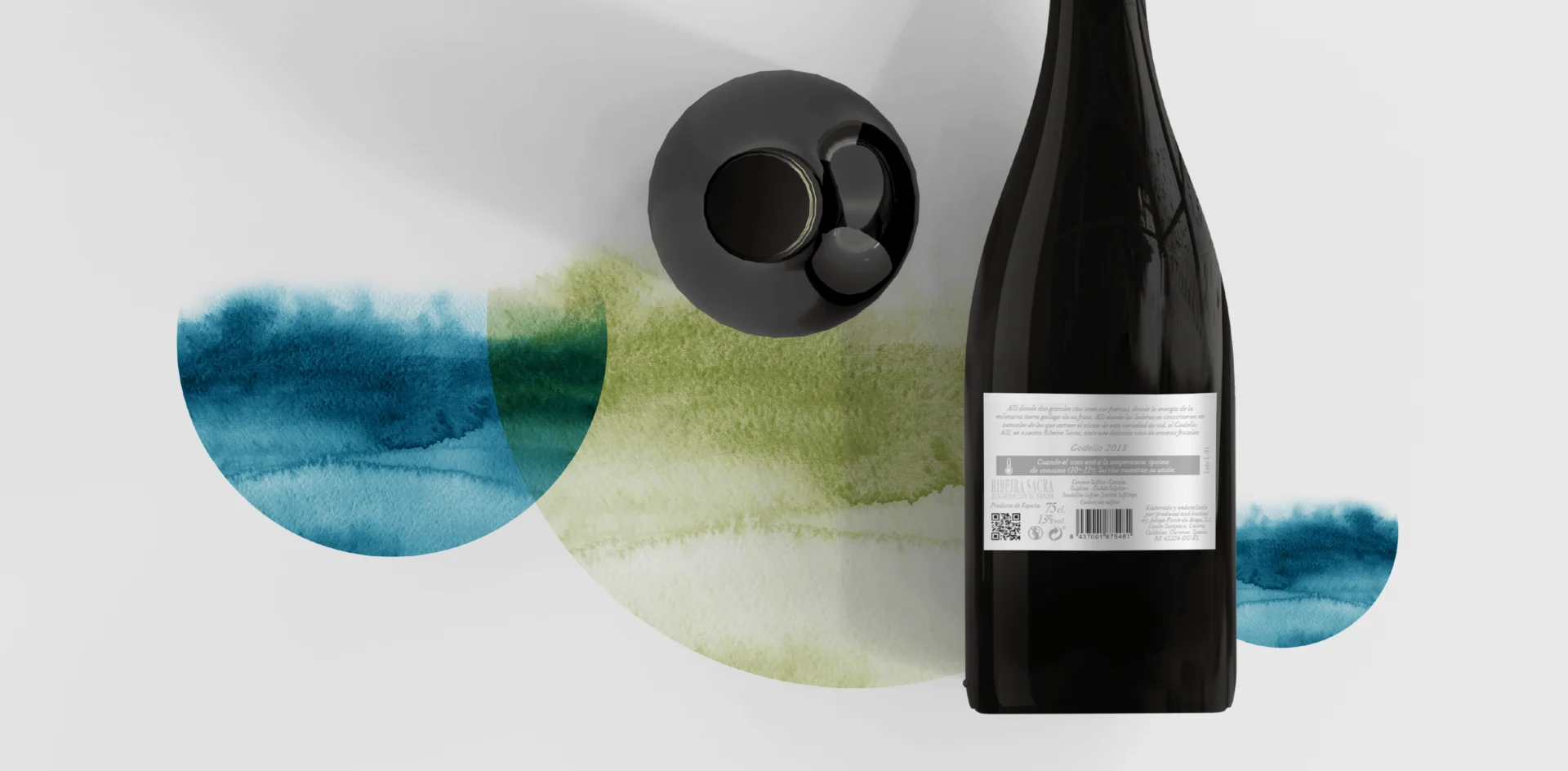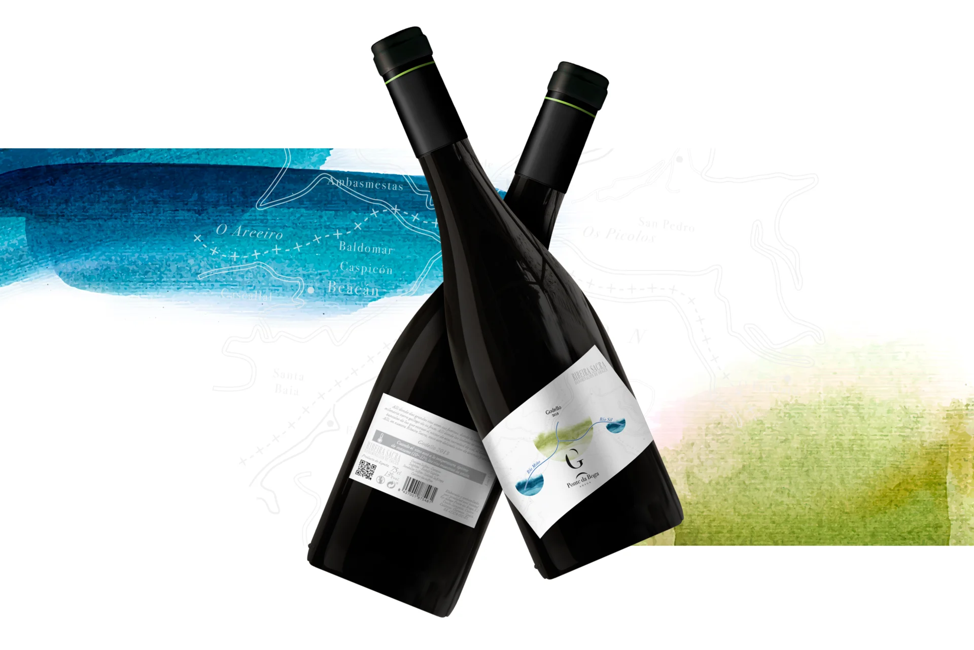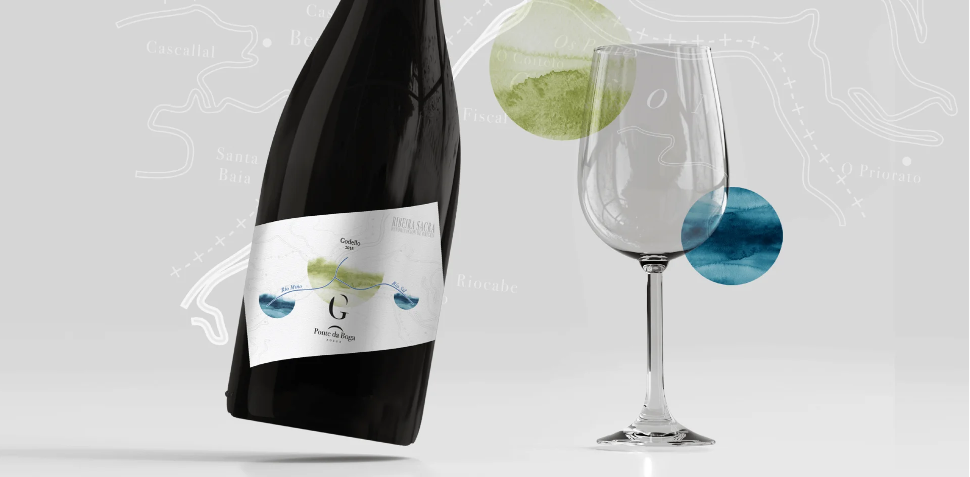 Se creó una etiqueta basada en el mapa de la zona, donde la unión de los ríos Miño y Sil cobra protagonismo. Se incorporó una tinta termosensible que, al enfriarse la botella, revela en azul el recorrido de ambos ríos, reforzando el concepto de frescura y conexión con la tierra. El resultado es un diseño funcional, evocador y fiel al espíritu gallego del vino.